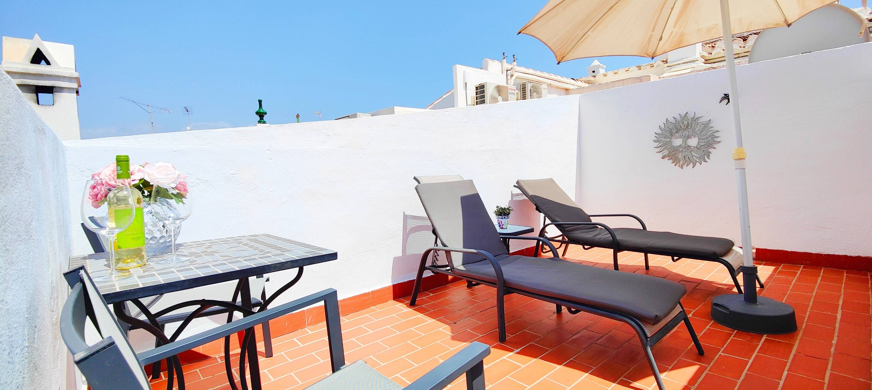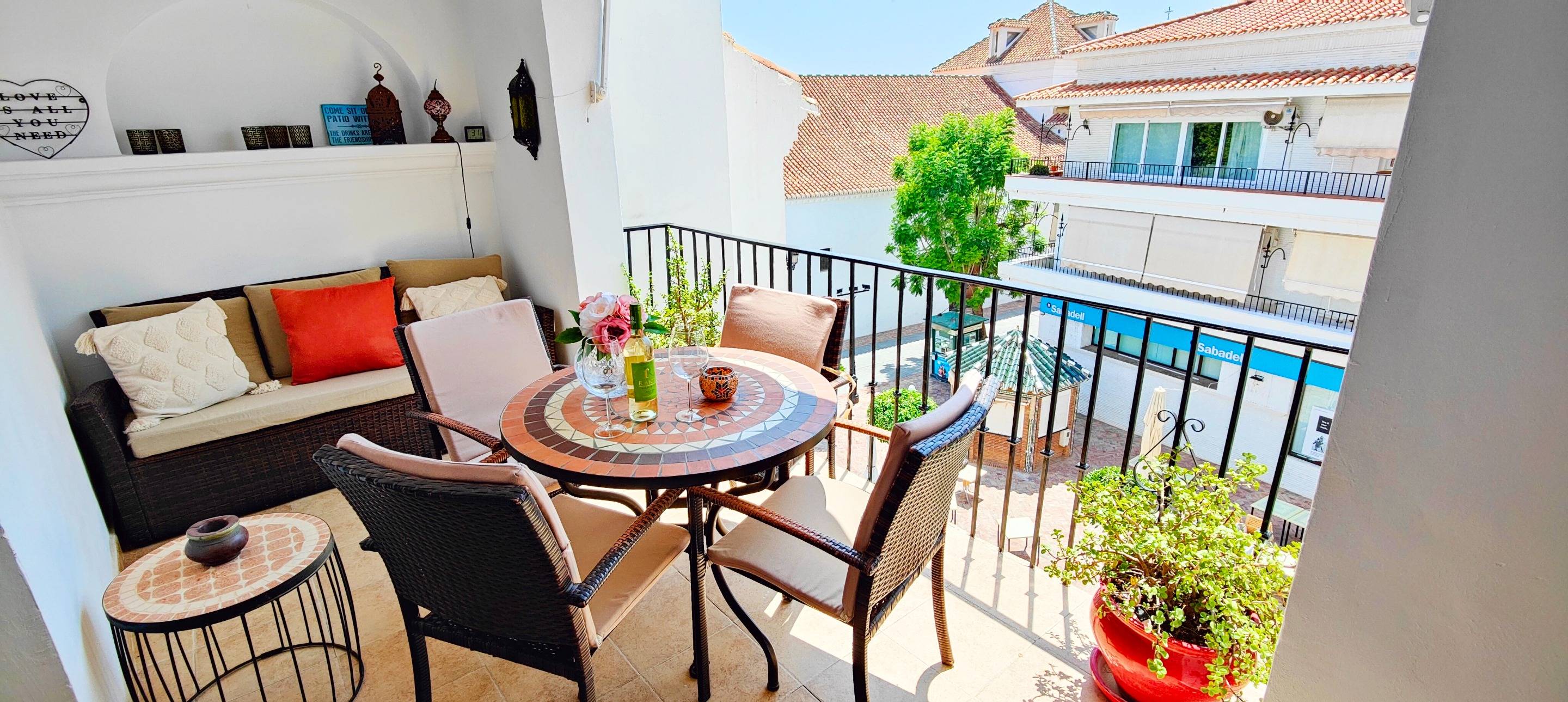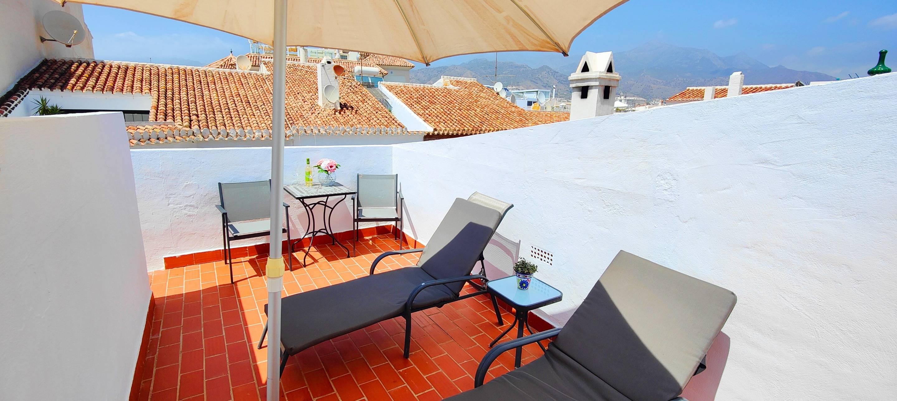 Penthouse located in the very centre of Nerja, on the famous Balcon de Europa. ~This apartment is located on the 3rd floor of a small block of apartments with lift however there are steps to the main entrance. The living area is built over one floor and comprises of the following; a spacious living – dining room with high ceilings, decorated and furnished in a traditional style, AC and access via patio doors to a nice west-facing terrace with Built in seating area, table and chairs for dining al fresco and with lovely views of the Church and the Balcón de Europa. ~~There are two bedrooms, the spacious master has a King-sized bed dressing room area, air-conditioning ensuite shower room and access to the west facing terrace; the second smaller bedroom has two single beds, Air conditioning and a spacious wardrobe. There is also a further family shower room. ~The independent kitchen is fully equipped with a fridge-freezer, 2 burner stove, combined oven-microwave, wine fridge and dishwasher. There is also a utility room next to the kitchen, where the washing machine is located and access to the private roof terrace / solarium, equipped with sun loungers and a large parasol.~Due to its location, this property offers a magnificent opportunity to enjoy the center of town, as well as the style and comfort that this penthouse offers ~The apartment has been rented commercially for the past few years and has an excellent rental record, making it a great investment. ~~~