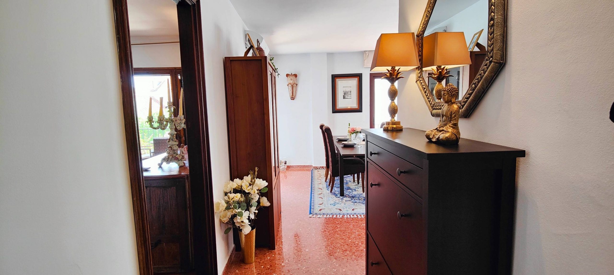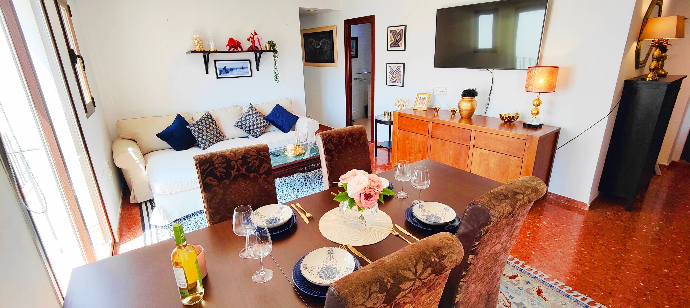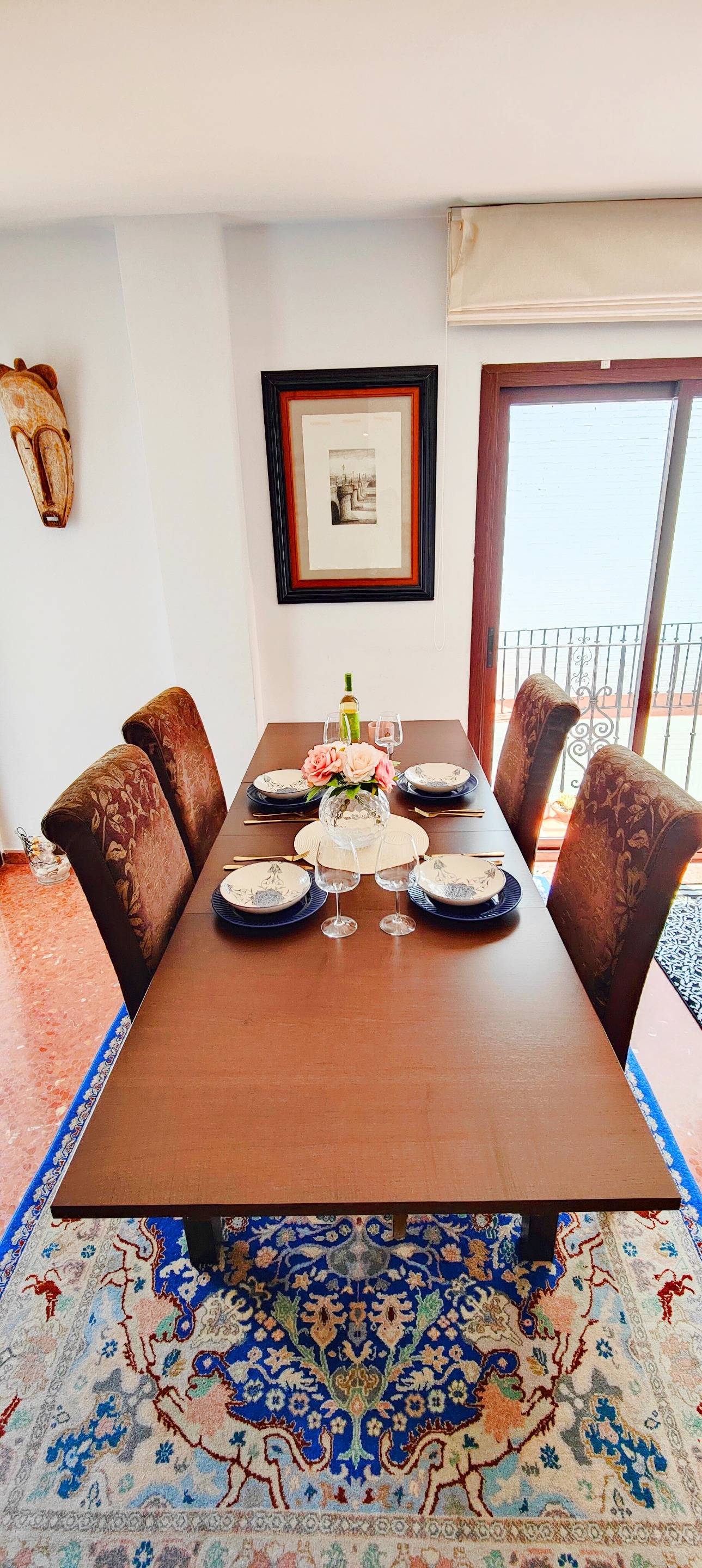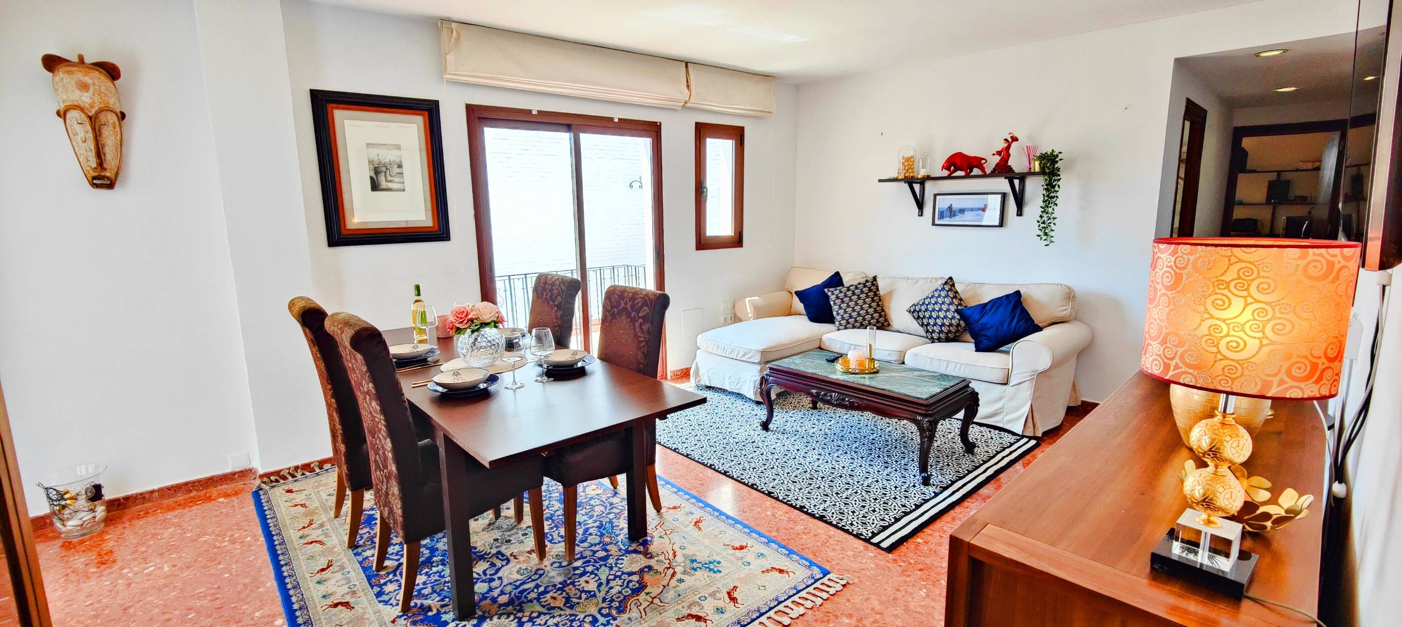 Penthouse located in the very centre of Nerja, on the famous Balcon de Europa. ~This apartment is located on the 3rd floor of a small block of apartments with lift however there are steps to the main entrance. The living area is built over one floor and comprises of the following; a spacious living – dining room with high ceilings, decorated and furnished in a traditional style, AC and access via patio doors to a nice west-facing terrace with Built in seating area, table and chairs for dining al fresco and with lovely views of the Church and the Balcón de Europa. ~~There are two bedrooms, the spacious master has a King-sized bed dressing room area, air-conditioning ensuite shower room and access to the west facing terrace; the second smaller bedroom has two single beds, Air conditioning and a spacious wardrobe. There is also a further family shower room. ~The independent kitchen is fully equipped with a fridge-freezer, 2 burner stove, combined oven-microwave, wine fridge and dishwasher. There is also a utility room next to the kitchen, where the washing machine is located and access to the private roof terrace / solarium, equipped with sun loungers and a large parasol.~Due to its location, this property offers a magnificent opportunity to enjoy the center of town, as well as the style and comfort that this penthouse offers ~The apartment has been rented commercially for the past few years and has an excellent rental record, making it a great investment. ~~~