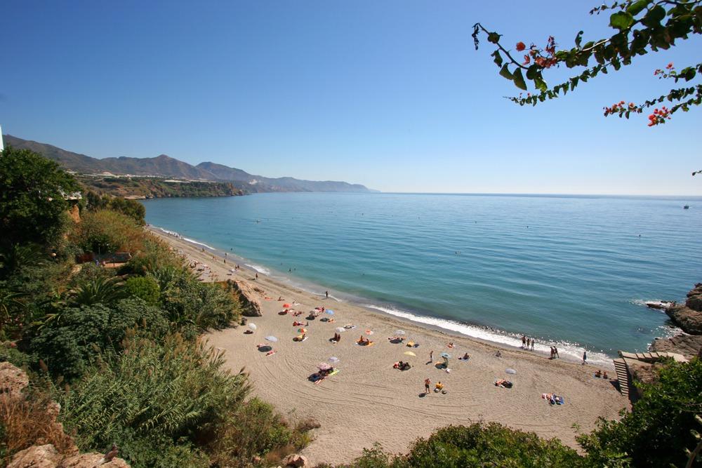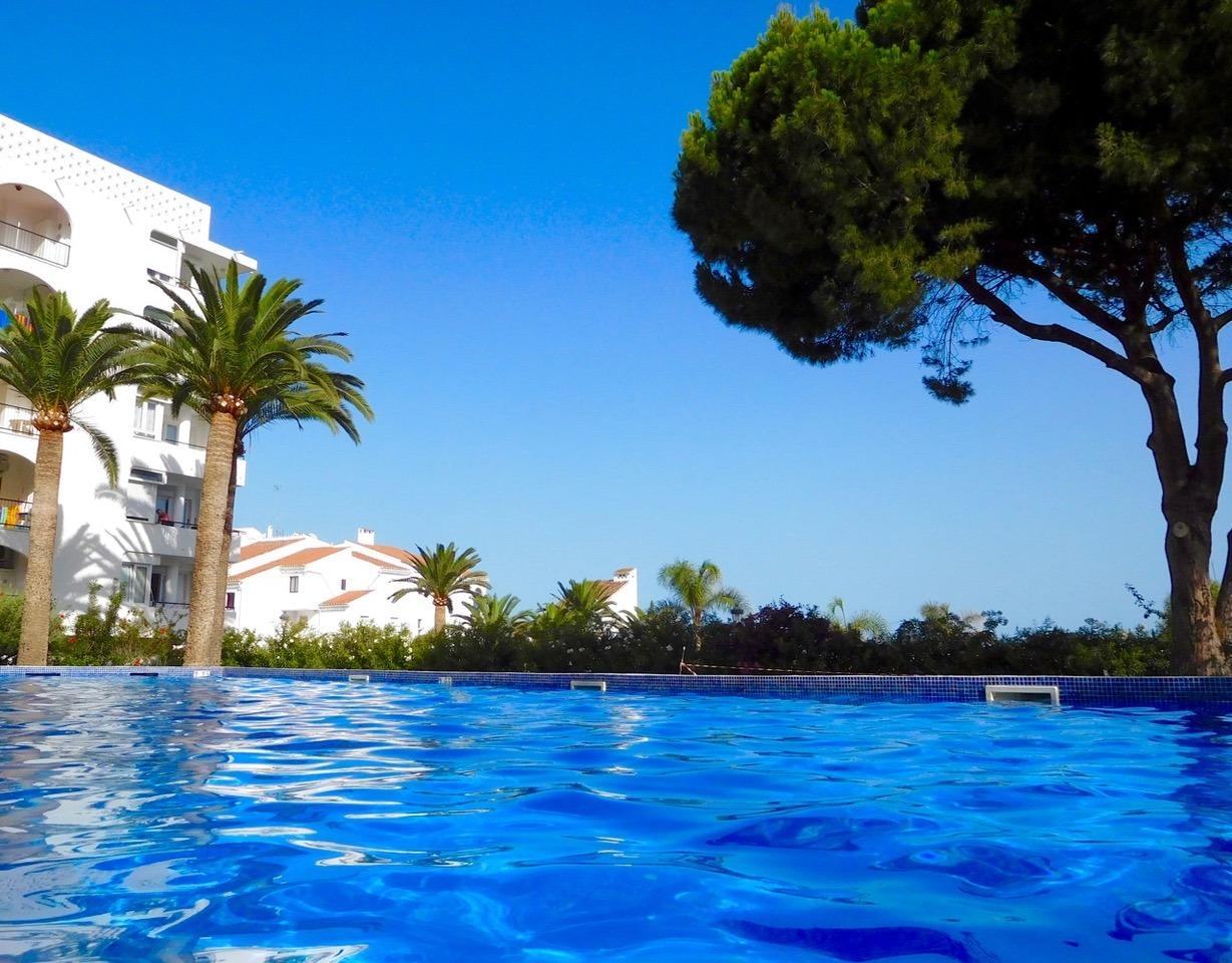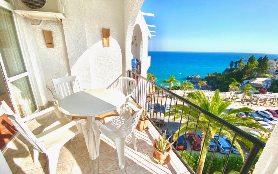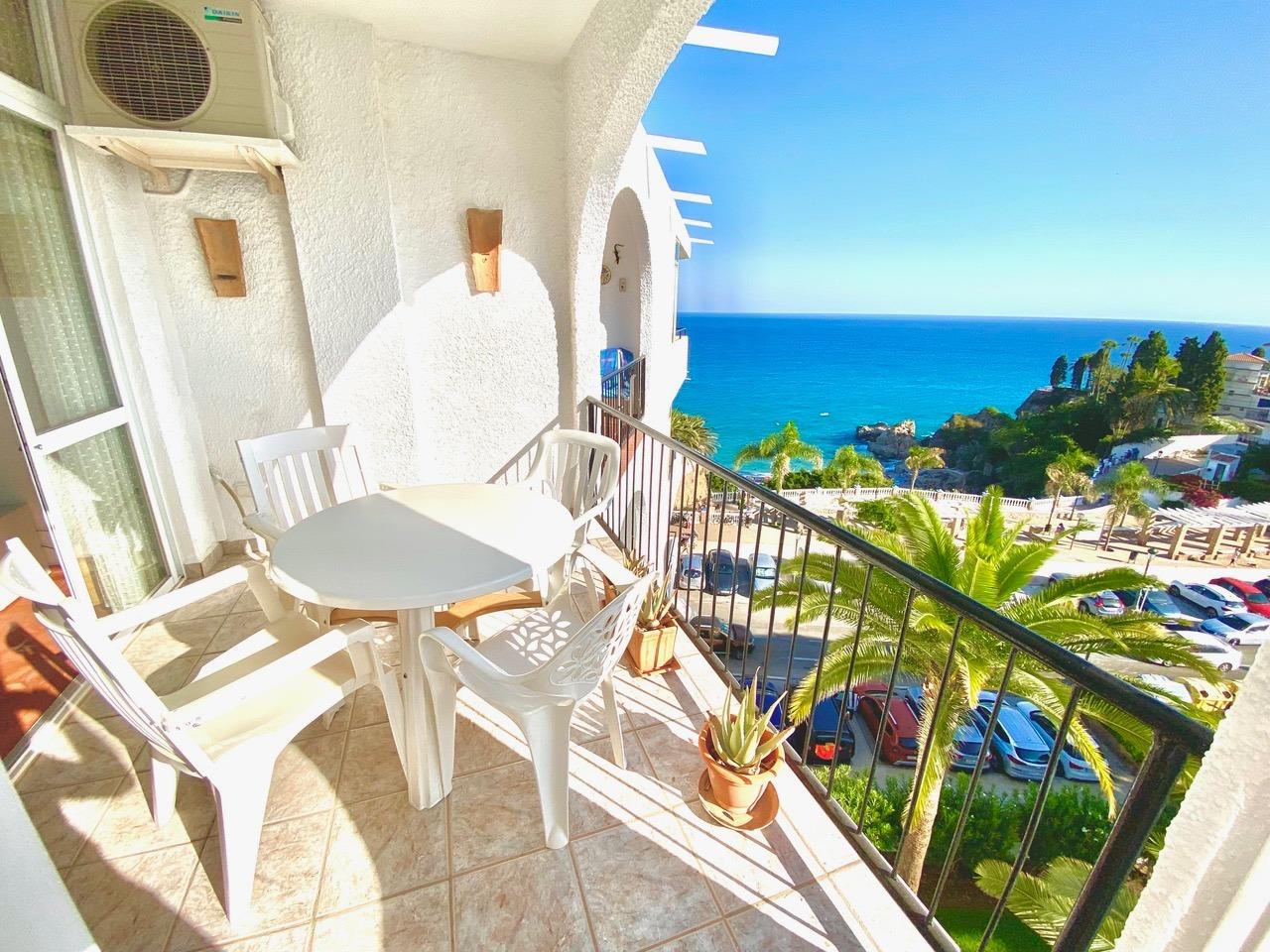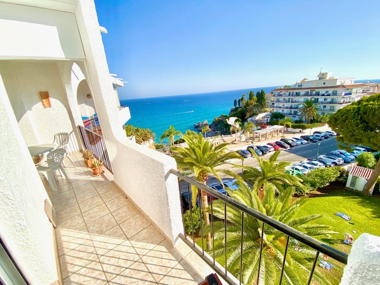 For sale this spectacular apartment, located in the very centre, only 7-8 minutes’ walk from the Balcon de Europa, where you will find lots of shops and restaurants. The beach is only 3 minutes away access by path and stairs.~~This is a very special apartment with 2 bedrooms and 1 bathroom, with extraordinary sea views, in one of the most sought after complexes in Nerja due to its good location in the centre of Nerja and with the beach just below. ~~The sea and pool views of the complex from the terrace and bedroom balcony make it a perfect place to have a drink or dine al fresco at any time of the day and especially with the pleasant evening sun all year round, listening to the gentle sound of the waves relaxing you to sleep.~~Spacious living and dining room, separate kitchen, a master bedroom with double bed and the second bedroom with 2 single beds. Both with fitted wardrobes.~~The complex has a communal garden and swimming pool, very quiet even in summer time. The swimming pool is open from the first month of April until the end of October. Garden open all year round.~~Air conditioning (heating also) in the living room.~~Parking area within the complex on a first come first served basis.~~This is an excellent opportunity to buy in one of the most sought-after complexes in Nerja due to its location and views. The flat has a south-west orientation so you can enjoy sun all day long both in winter and summer.~~~